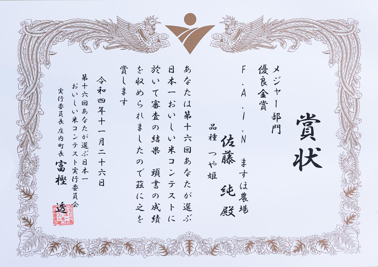 令和6年11月28日に松柏会館において多数の関係者ご臨席の下、米品評会が執り行われ当農場の『つや姫』が総合展418.6点を獲得し優良賞を受賞しました。