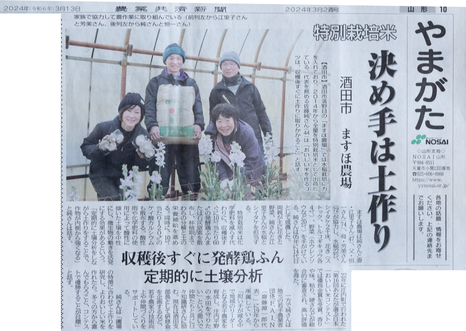 農業共済新聞 やまがた 令和6年3月13日号にますほ農場が掲載されました。