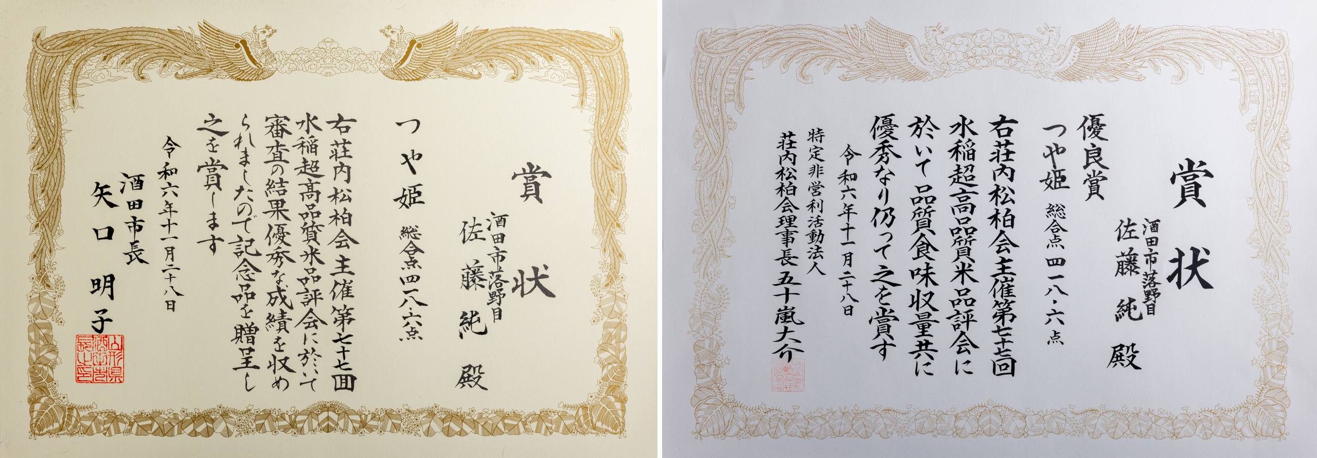 令和6年11月28日に松柏会館において多数の関係者ご臨席の下、米品評会が執り行われ当農場の『つや姫』が総合展418.6点を獲得し優良賞を受賞しました。